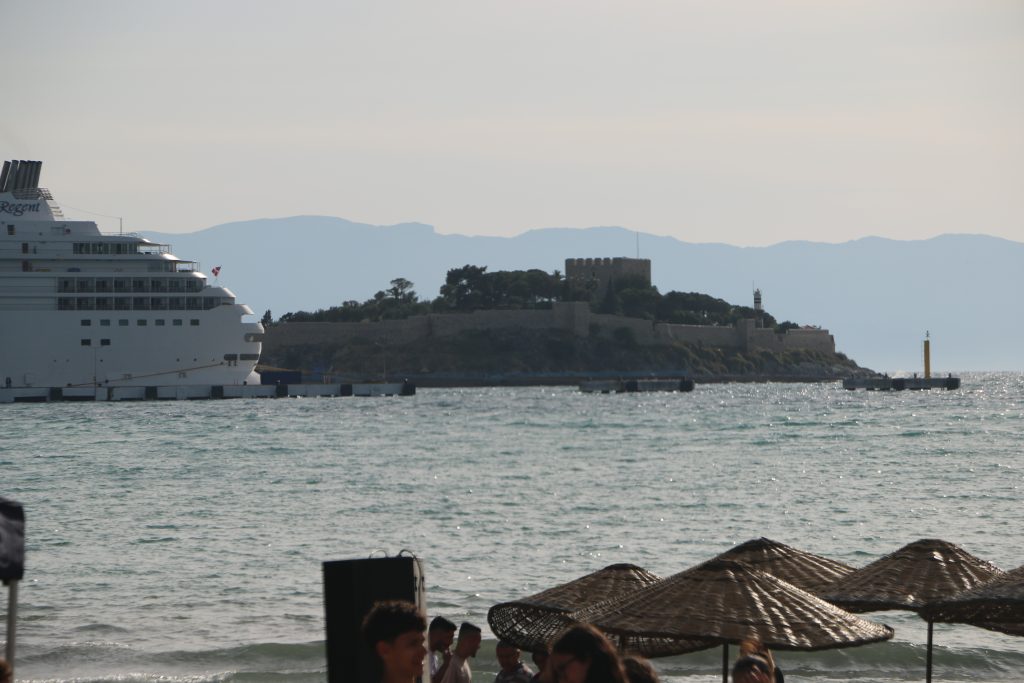 We took a walk, since if we stayed in our room we would have slept through dinner, and then sat by the water. In the distance was a cruise ship, behind it the Kusadasi Kalesi, or Castle.