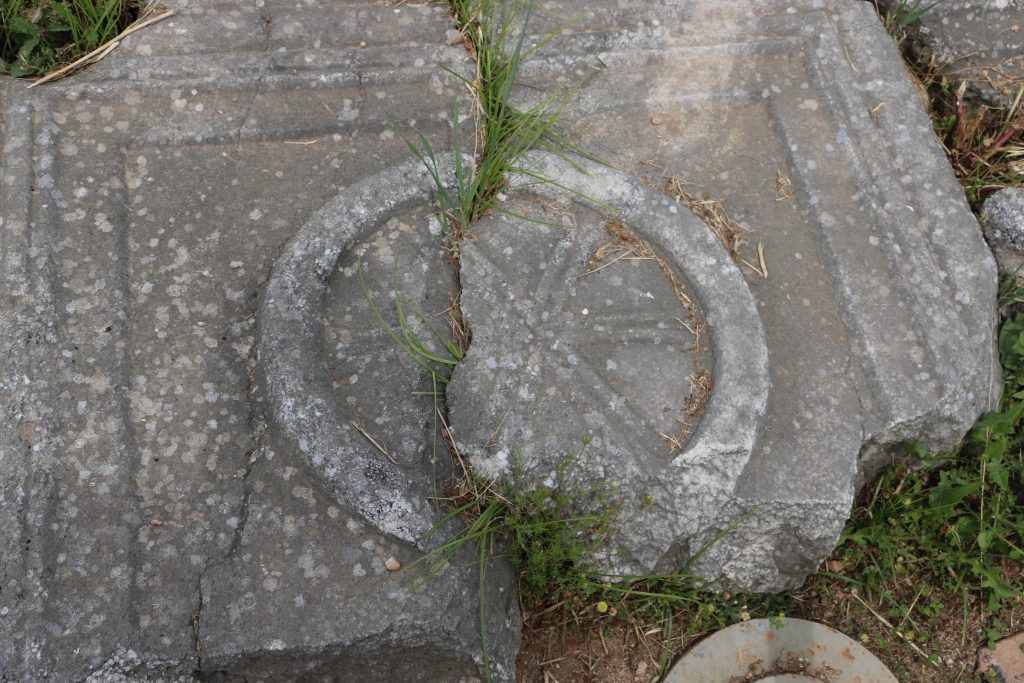 The circle with what looks like wagon wheel spokes is actually a symbol that contains all the Greek letters of the Icthys. The Icthys was early Christian symbol, the transliteration of the Greek word ixous, “fish.” ἸΧΘΥΣ (IKhThUS), or also ἸΧΘΥϹ, is an acronym or acrostic for “Ἰησοῦς Χρῑστός Θεοῦ Υἱός Σωτήρ”, Iēsoûs Khrīstós, Theoû Huiós, Sōtḗr; which translates into English as ‘Jesus Christ, God’s Son, Savior’.