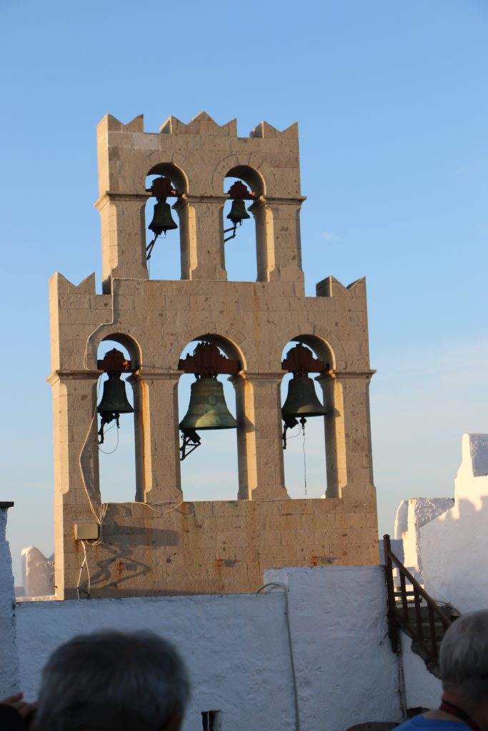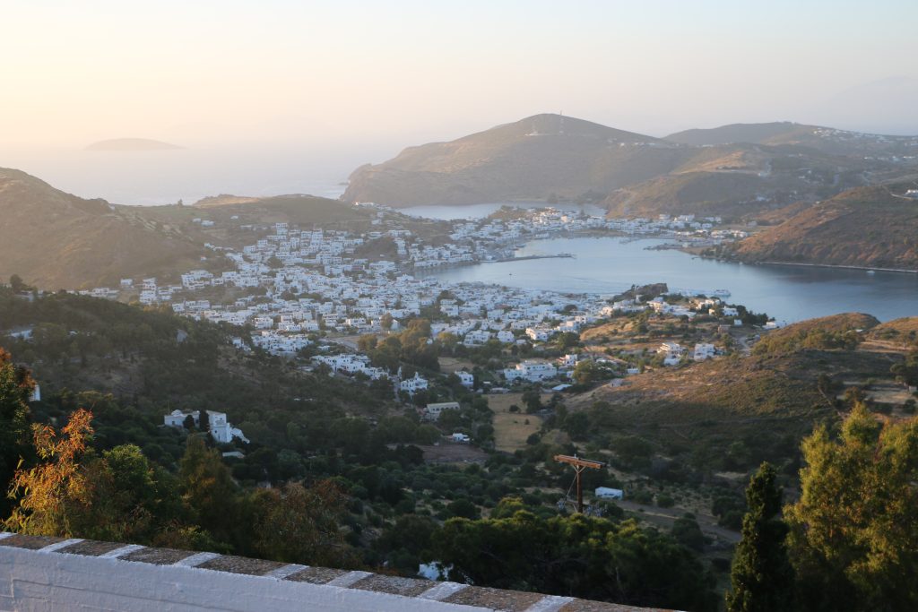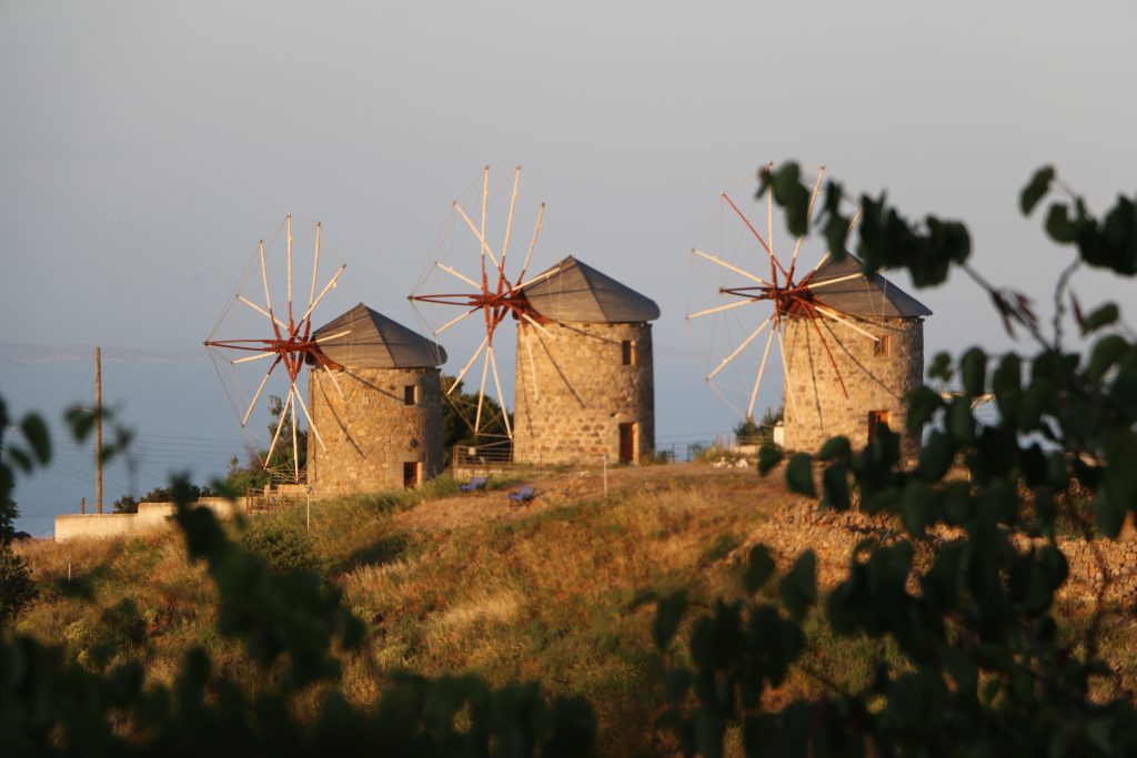 On the way in, from the boat, and from several places around the island, three windmills are visible to the north of the monastery, with the setting sun casting a warm light on them. I was able to get a shot of it on our way down from the monastery.